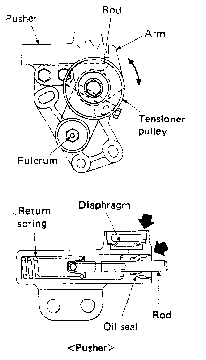 Inspect auto-tensioner for oil leaks from pusher rod and diaphragm.