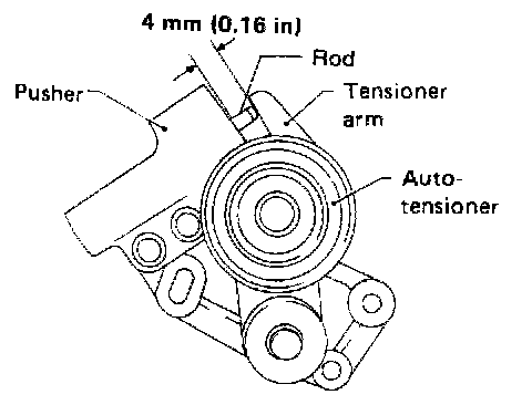 5. Adjust tensioner arm to give 4 mm (0.16 in) clearance with pusher of auto-tensioner using a suitable vise. and then insert stopper bolt into tensioner arm in order that clearance does not change.