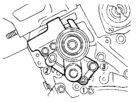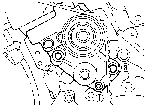 Set tensioner slightly by pushing timing belt. Then, turn crankshaft 10 degrees clockwise and tighten nut 1 and bolts 2 & 3 to 16 - 21 Nm (12 - 15 ft lb).