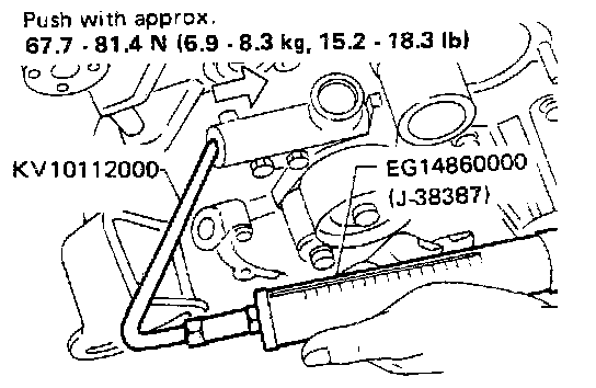 15. Set plate and push it with 49 N (5 kg, 11 lb) force using Tool (push-pull gauge) at each position of timing belt mid-way between pulleys as shown.