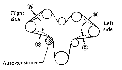 19. Check the proper installation (no slip or misplacement) of timing belt at each position as shown.