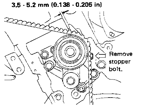 18. Remove the auto-tensioner stopper bolt. After 5 minutes check the projection of the rod (clearance between tensioner arm and pusher) stays at 3.5 - 5.2 mm (0.138 - 0.205 in).