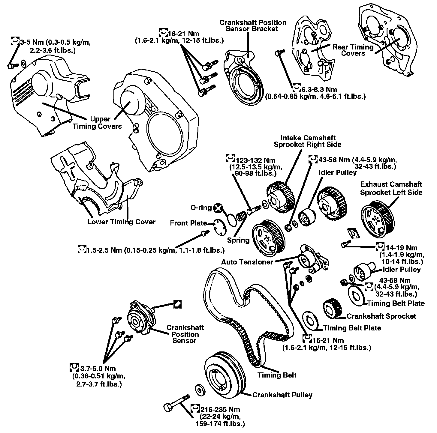 17. Confirm auto tensioner fixing nuts and bolts are tightened to 16 to 21 Nm (1.6 - 2.1 kg-m, 12 - 15 ft lb).