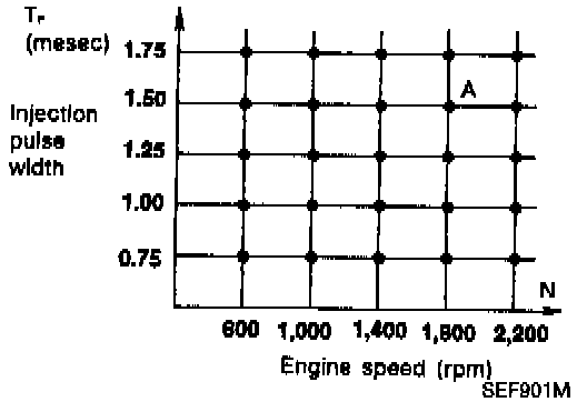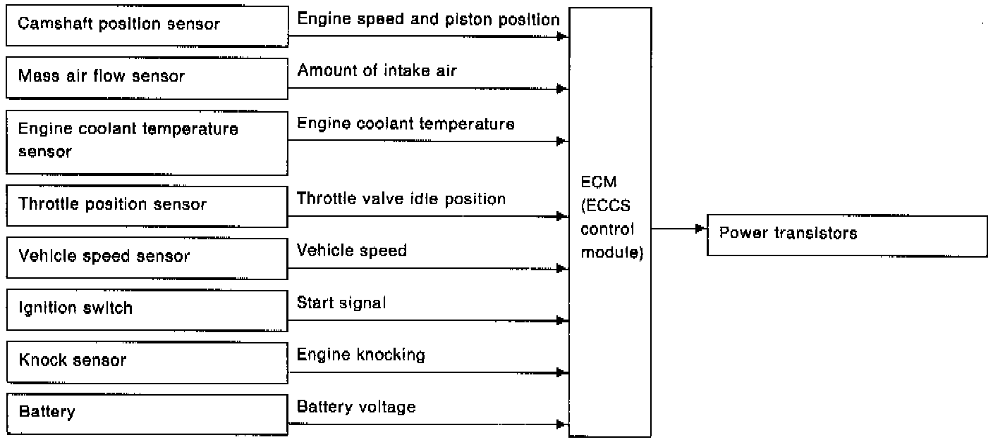 The ECM detects information such as the injection pulse width and camshaft position sensor signal which varies every moment. Then responding to this information, ignition signals are transmitted to the power transistor. (e.g. N: 1,800 rpm, Tp: 1.50 msec A BTDC)