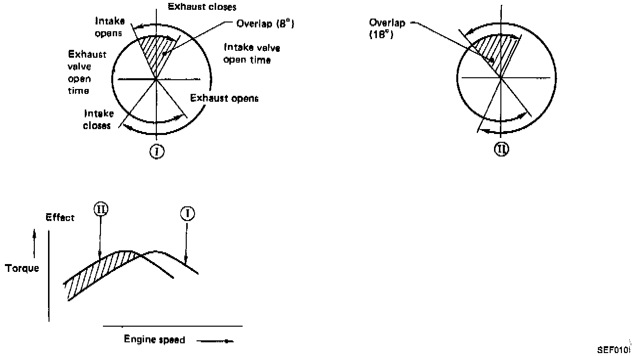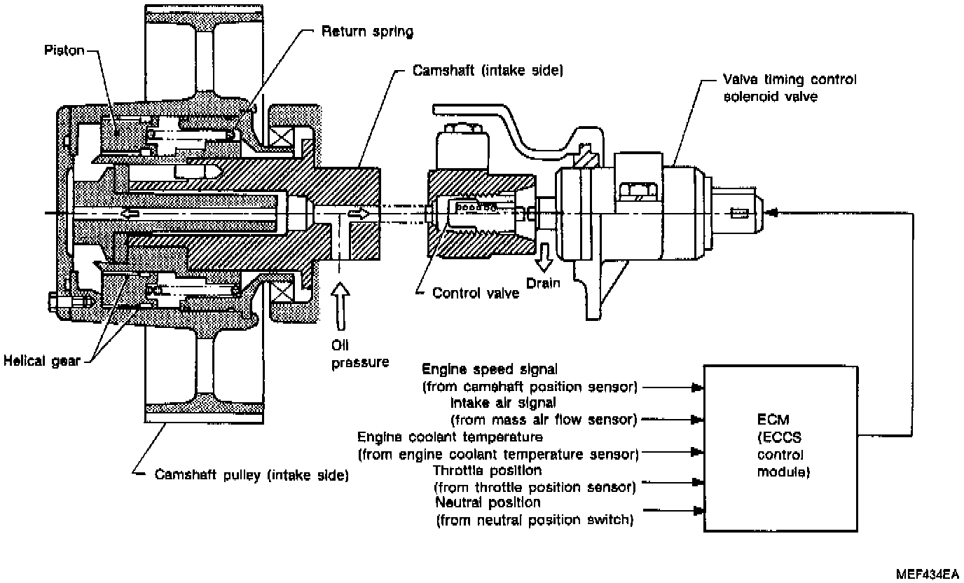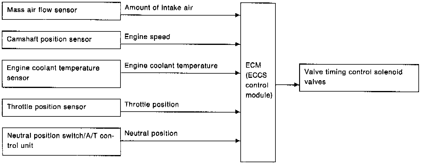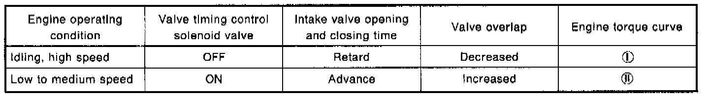 The valve timing control system is utilized to increase engine performance. Intake valve opening and closing time is controlled, according to the engine operating conditions, by the Engine Control Module (ECM). Engine coolant temperature signals, engine speed, amount of intake air, throttle position and gear position are used to determine intake valve timing.