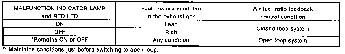 In this mode, the MALFUNCTION INDICATOR LAMP and RED LED display the condition of the fuel mixture (lean or rich) which is monitored by the heated oxygen sensor.