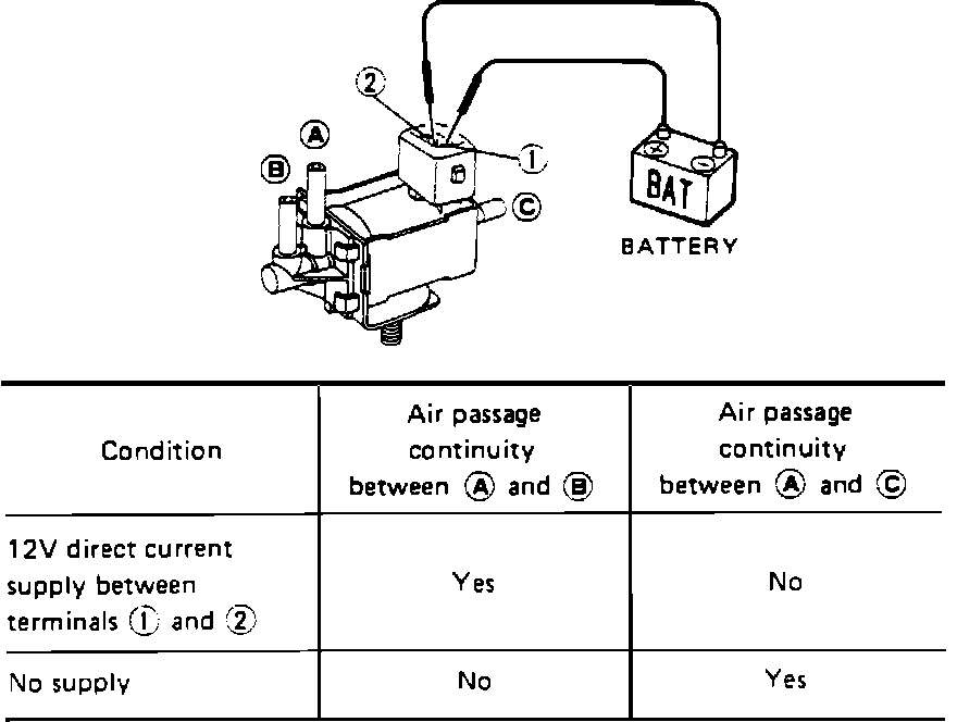 Apply voltage to the solenoid terminals and check air passages for continuity as shown.