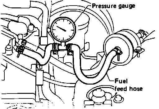 Disconnect fuel line from fuel filter and connect a suitable pressure gauge as shown.