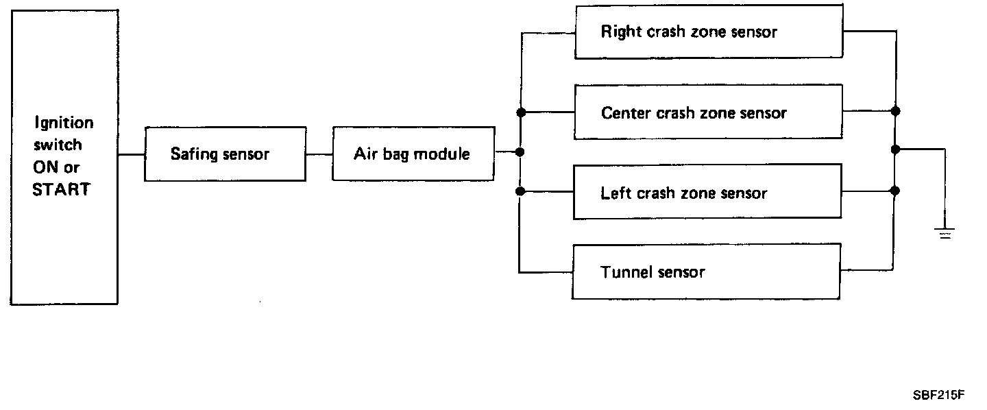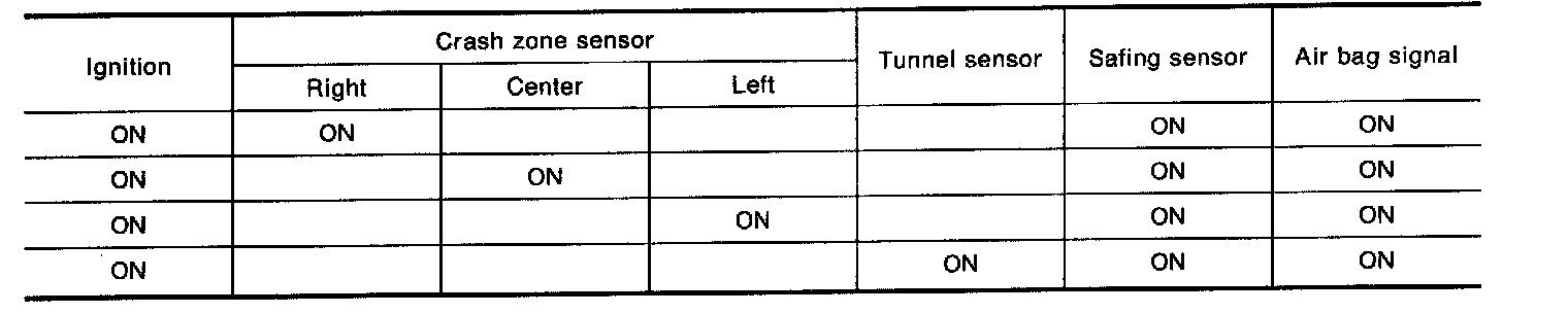 The air bag deploys when any of the four sensors (right crash zone sensor, center crash zone censor, left crash zone sensor or tunnel sensor) and the safing sensor simultaneously activate while the ignition switch is "ON".