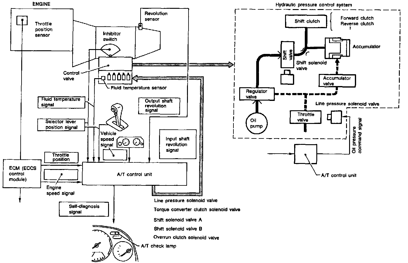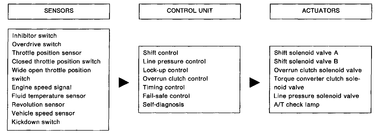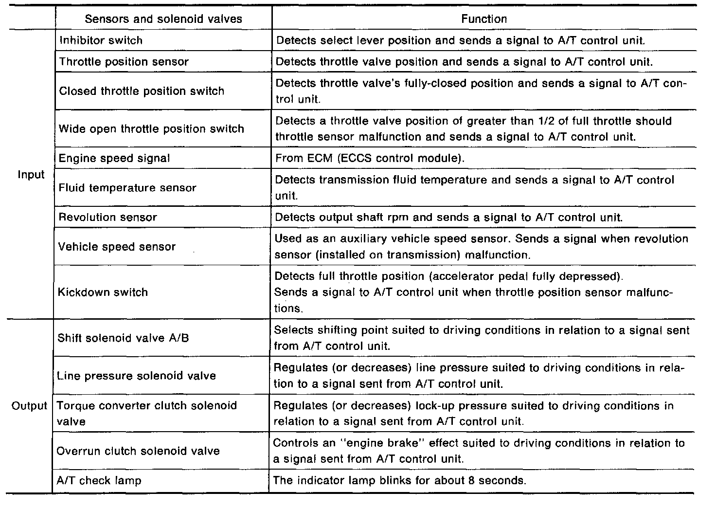 The A/T control unit receives signals sent from various switches and sensors, determines required line pressure, shifting point, lock-up operation, engine brake operation, and sends required signals to the respective solenoids.