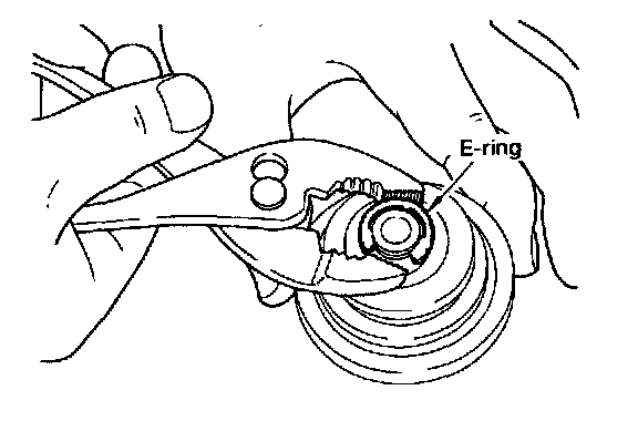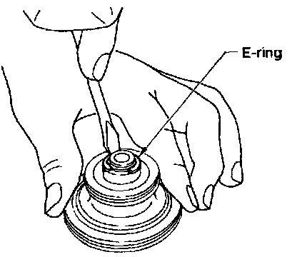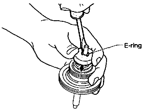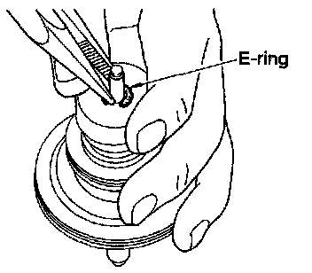 5. Place piston stem end on a wooden block. While pushing servo piston spring retainer down, remove E-ring.