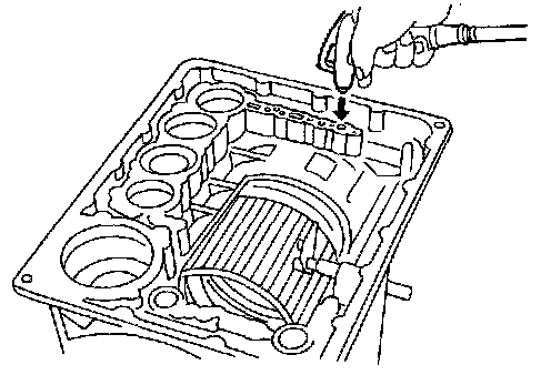 1. While holding overrun clutch piston, gradually apply compressed air to oil hole.