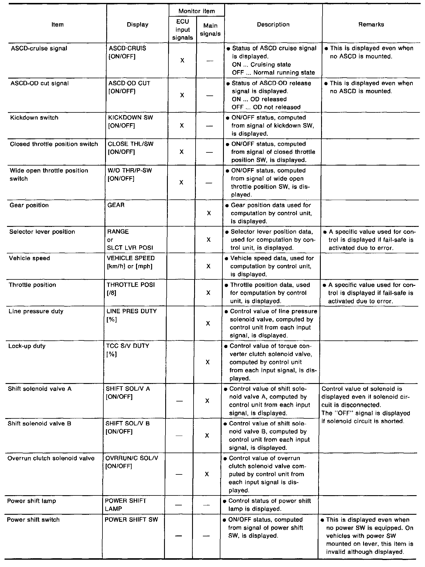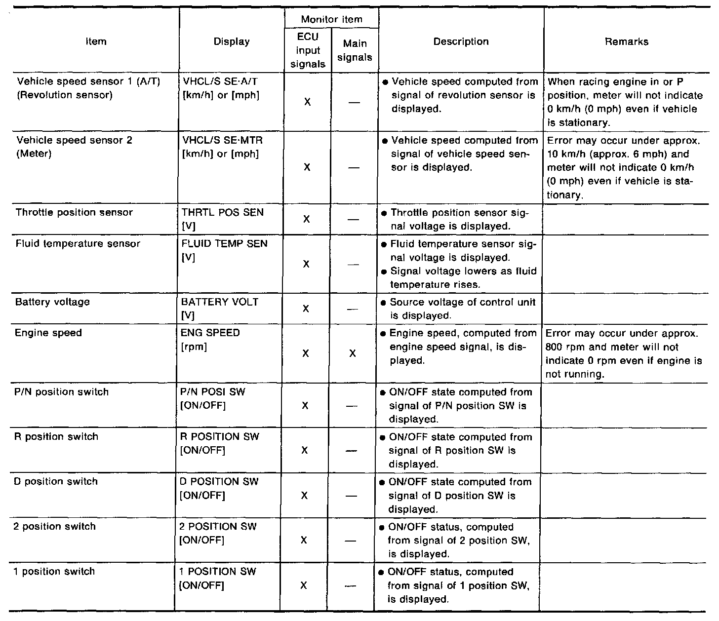 2. When select main signals on CONSULT, monitored items for understanding the overall operation of the system are set, and this setting is indicated by a reversed display.