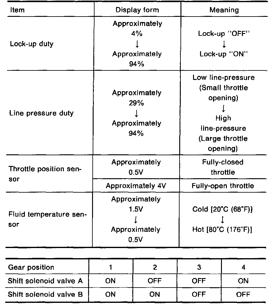 3. Shift solenoid valve "A" or "B" is displayed on CONSULT at the start of shifting while gear position is displayed upon completion of shifting (which is computed by A/T control unit).