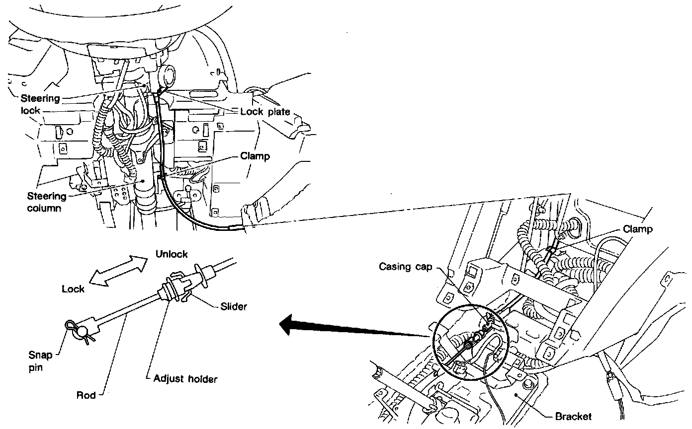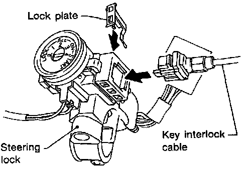 1. Set key interlock cable to steering lock assembly and install lock plate.