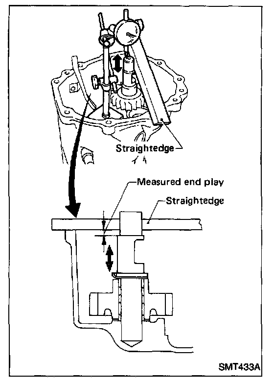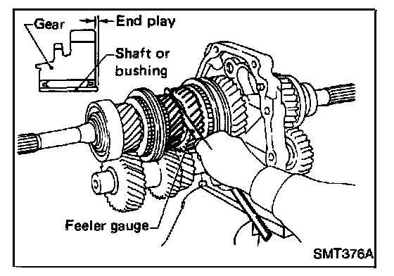 d. Move reverse idler shaft up and down and measure reverse idler gear end play.