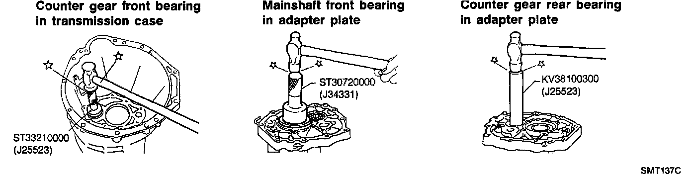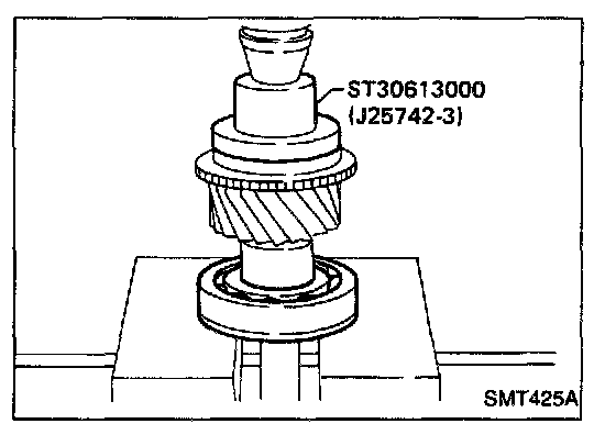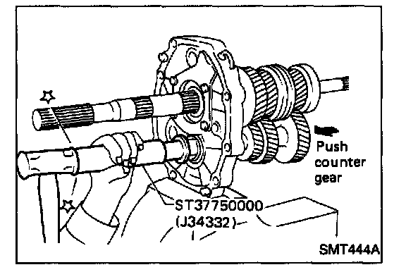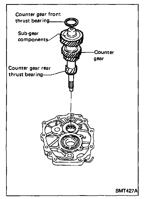 5. Select proper counter gear front bearing shim when replacing transmission case, counter gear, counter gear thrust bearing or sub-gear components.