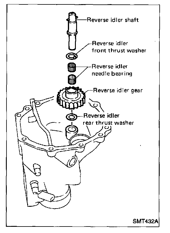 j. Install reverse gear needle bearing and then install reverse main gear, reverse idler gear and reverse idler thrust washers.