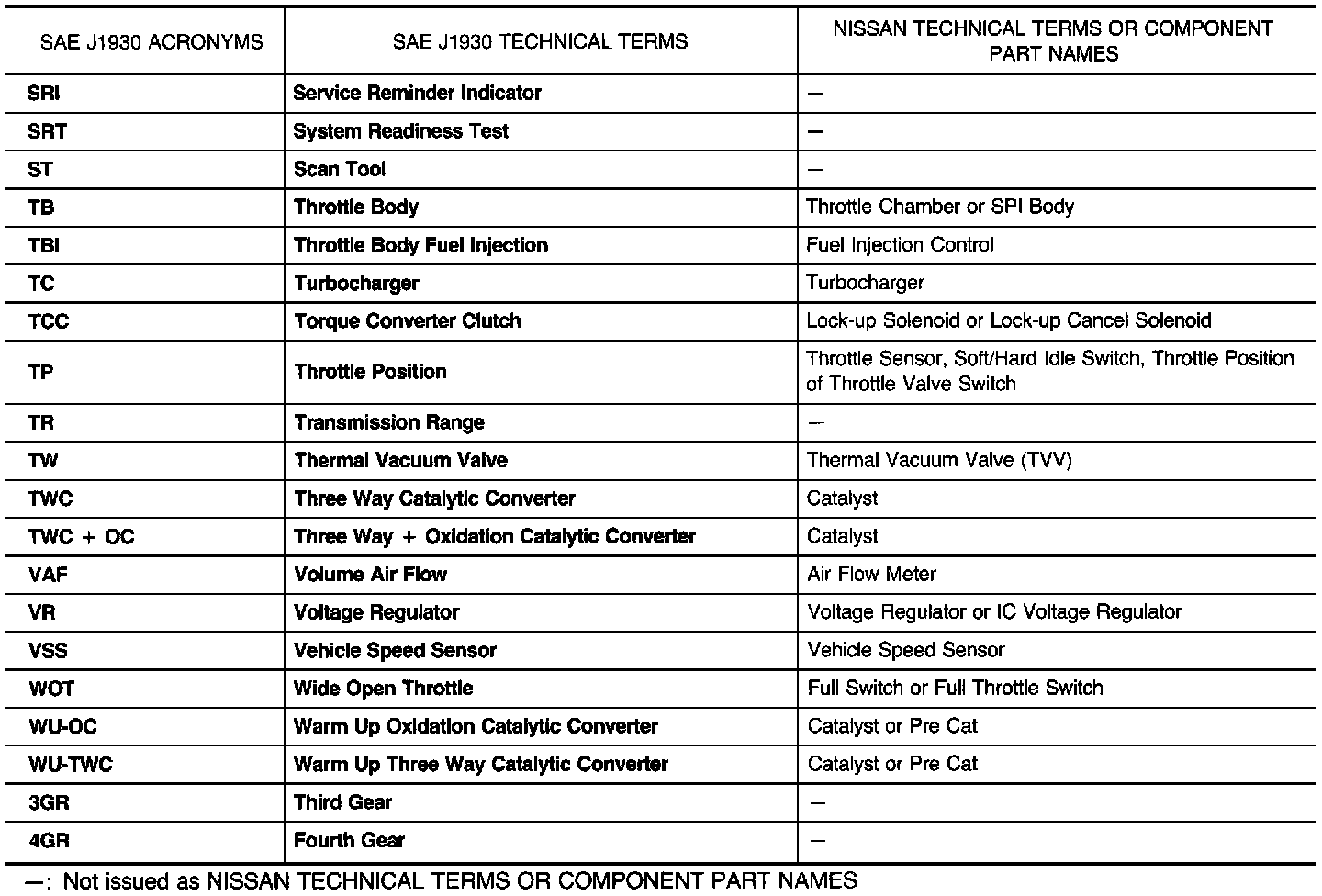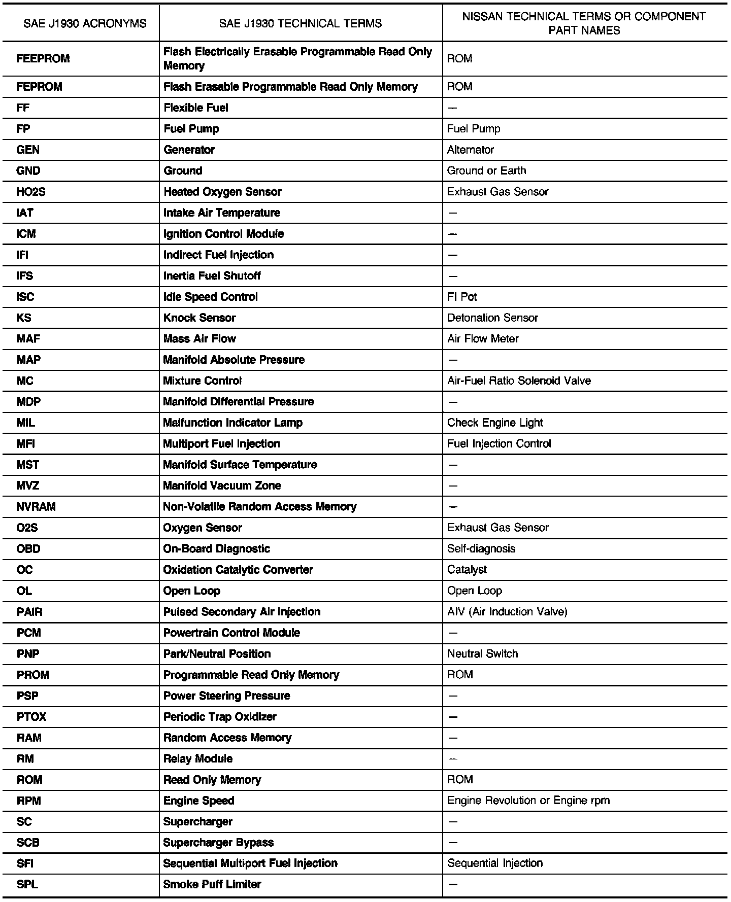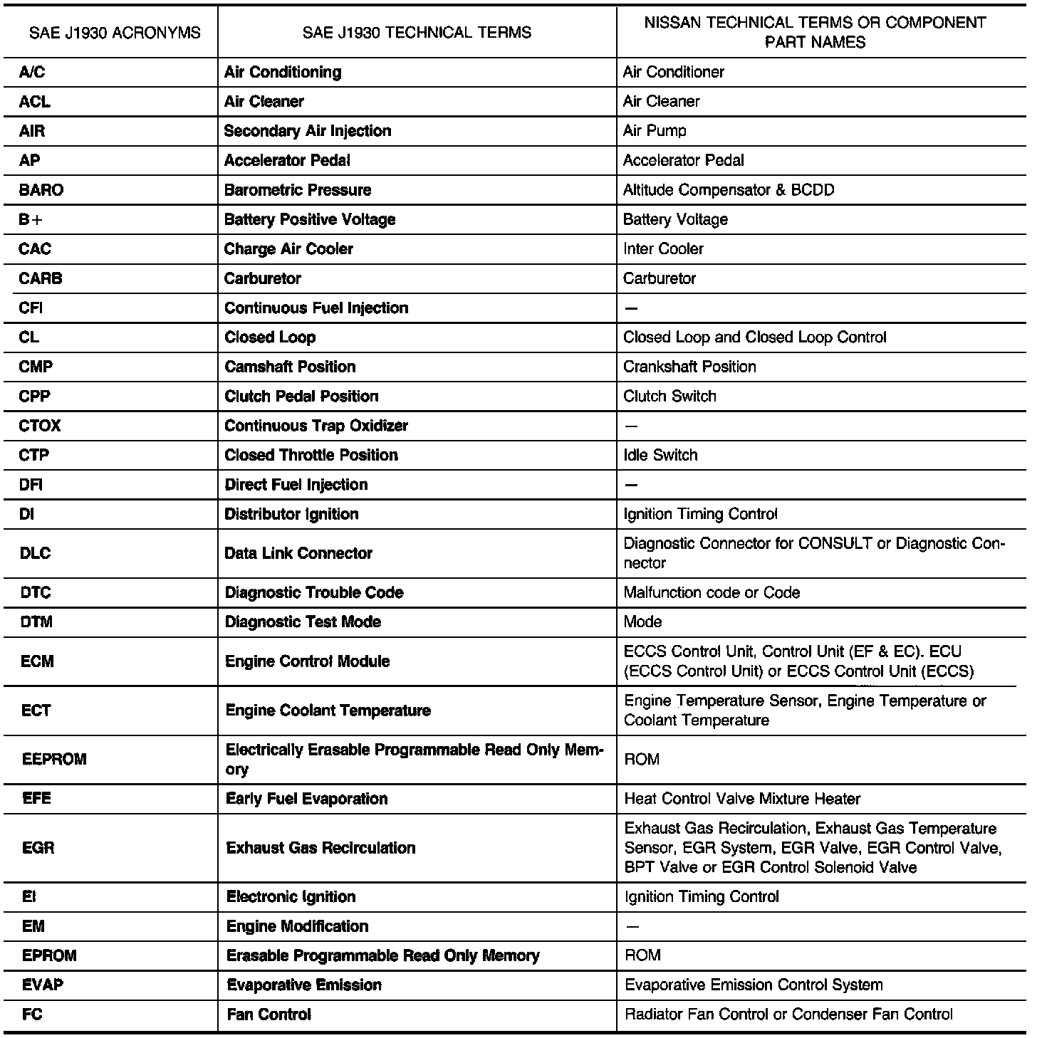 The glossary is a list comprising the acronyms and technical terms that are described in SAE J1930 and NISSAN technical terms.