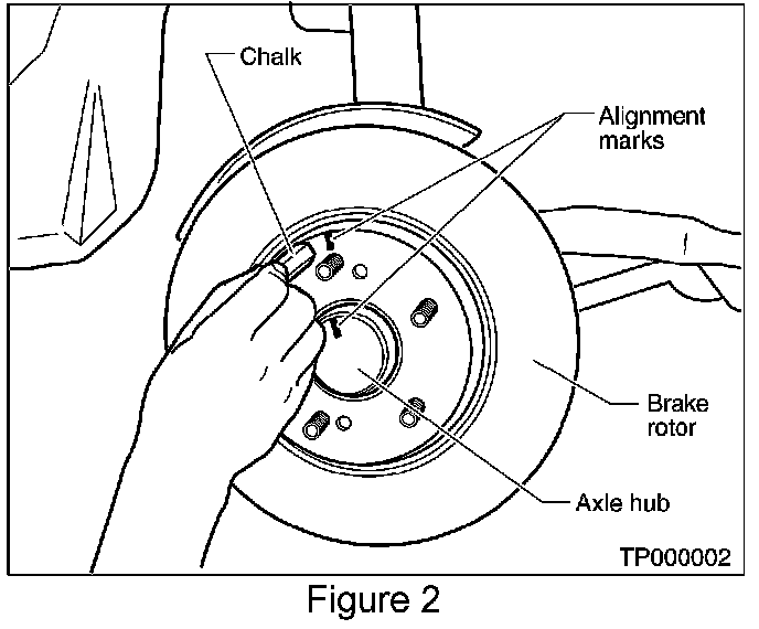 ^ If the rotor must be removed for any reason, mark the exact location (rotor to axle hub) before removing the rotor (see Figure 2).