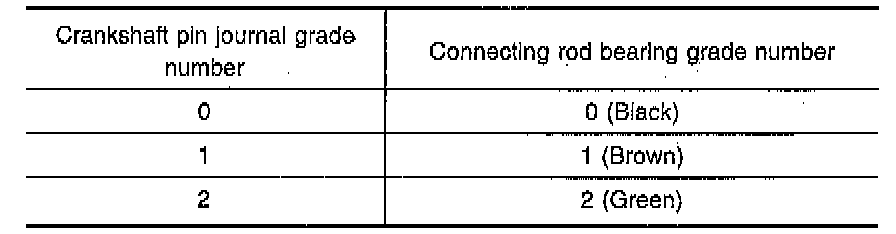 6. If it exceeds the limit, replace bearing. If clearance cannot be adjusted within the standard of any bearing, grind the crankshaft journal and use undersized bearing. Refer to Crankshaft Main Bearing for bearing clearance information. If the crankshaft is replaced with a new one, select connecting rod bearings according to the following table. The connecting rod bearing grade numbers are punched in either Arabic or Roman numerals.