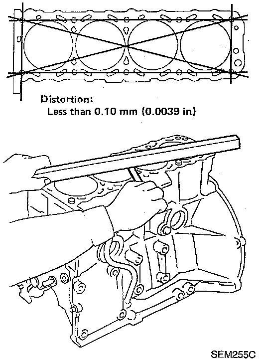 1. Clean the upper surface of cylinder block. Using a reliable straightedge and feeler gauge, check the flatness of the cylinder block surface. Check along six positions as shown in figure. The standard is less than 0.03 mm (0.0012 inch). The limit is 0.1 mm (0.004 inch).
