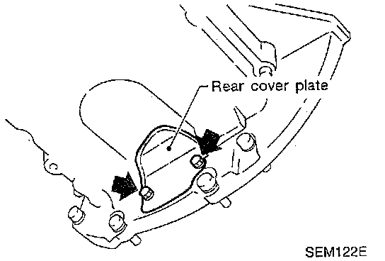 1. Use a scraper to remove all traces of liquid gasket from mating surfaces. Also, remove traces of liquid gasket from mating surfaces of cylinder block, front cover and steel oil pan. Install the aluminum oil pan noting the following: