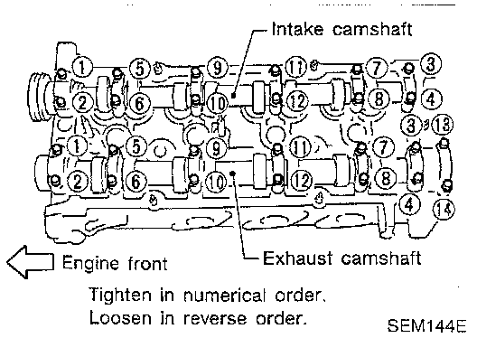 Tighten bearing cap bolts gradually in two or three steps. Start with center bearing and move outward as shown in figure.