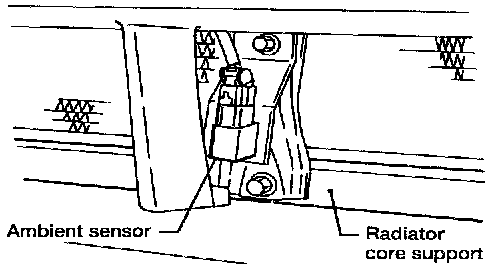 The ambient sensor is attached to the radiator core support. It detects ambient temperature and converts it into a resistance value which is then input to the auto amplifier.