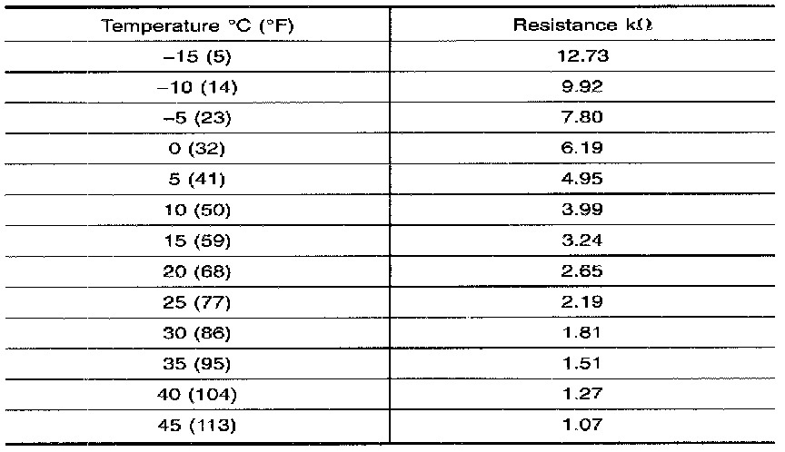 After disconnecting ambient sensor harness connector, measure resistance between sensor terminals (34) and (39), using the table in the image.
