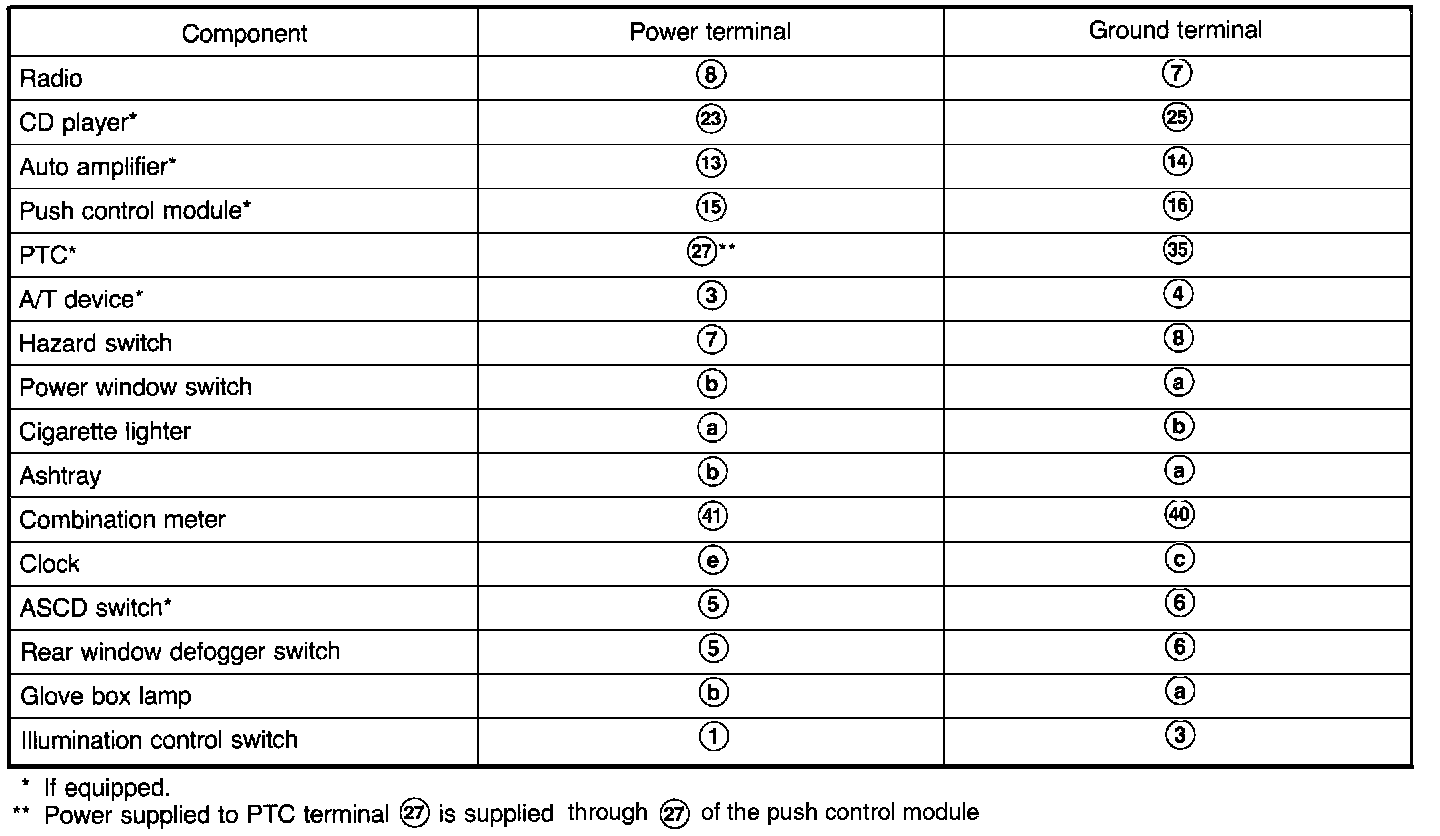 The following chart shows the power and ground connector terminals for the components included in the illumination system.