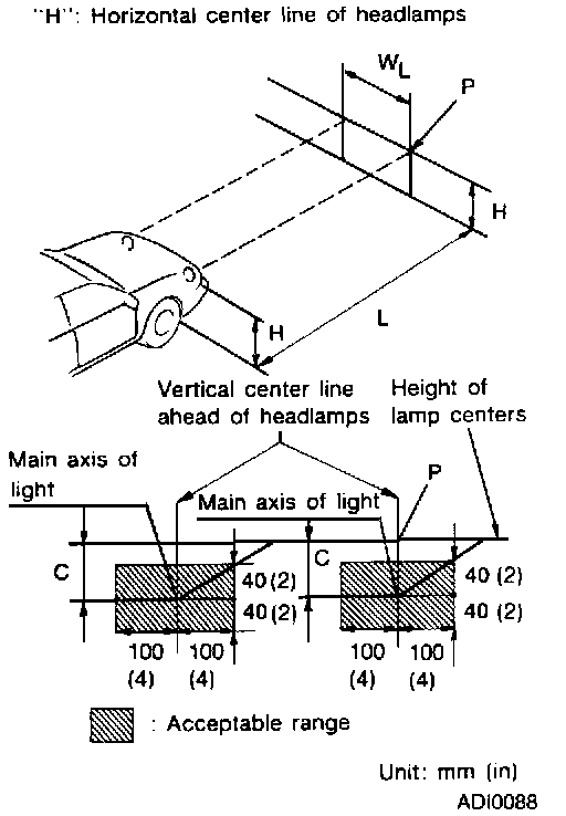 a. Adjust headlamps so that main axis of light is parallel to center line of body and is aligned with point P shown in the illustration.