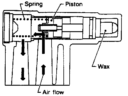 When engine coolant temperature is low, the air by-pass port opens. This allows air to by-pass the throttle plate, increasing idle speed. As the coolant temperature increases, the wax element expands, pushing the valve to the closed position. This lowers engine speed.