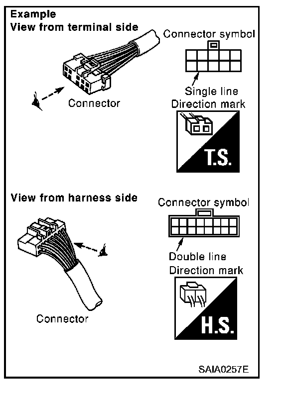 A direction mark is shown to clarify the side of connector (terminal side or harness side).