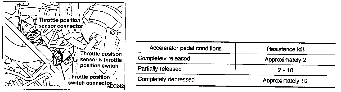 2. Using an ohm meter, check resistance across sensor terminals 2 and 3 changes while opening throttle valve manually.