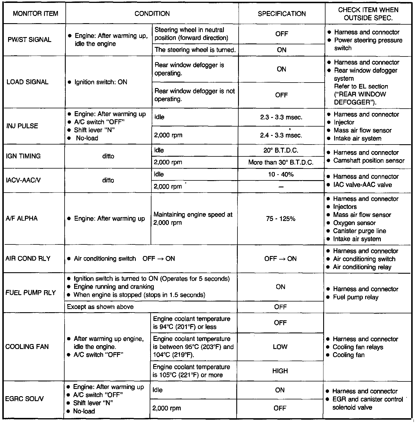 ie. Adjust ignition timing with a timing light before monitoring IGN. TIMING, because the monitor may show the specification data in spite of the ignition timing being not adjusted to the specification data. This IGN TIMING monitors the calculated data by ECM according to the input signals from camshaft position sensor and other ignition timing related sensors.