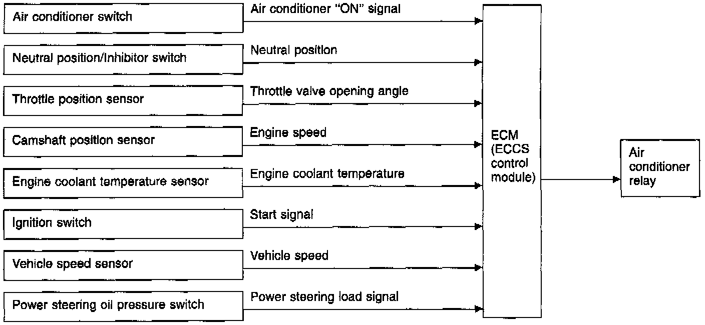 When the accelerator pedal is fully depressed the air conditioner is turned off for a few seconds. When engine coolant temperature becomes excessively high, the air conditioner is turned off. This continues until the coolant temperature becomes normal again.