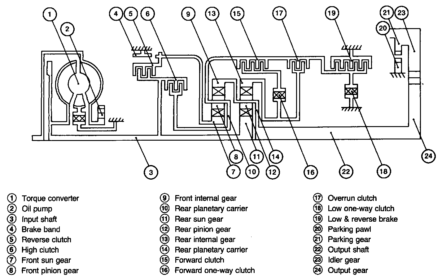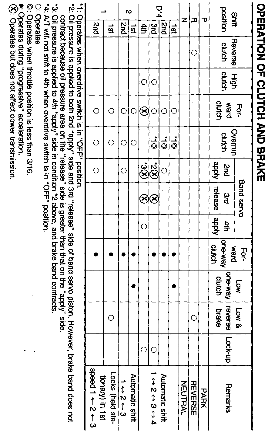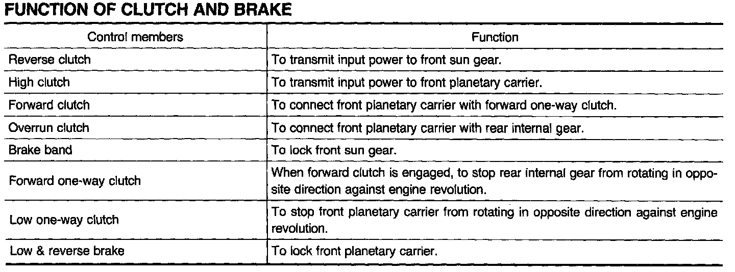 SHIFT MECHANISMThe RE4FO4A and RE4FO4V automatic transaxies use compact, dual planetary gear Systems to improve power transmission efficiency, simplify construction and reduce weight. Two one-way clutches are also employed. These one-way clutches, combined with two accumulators, reduce shifting shock to a minimum.