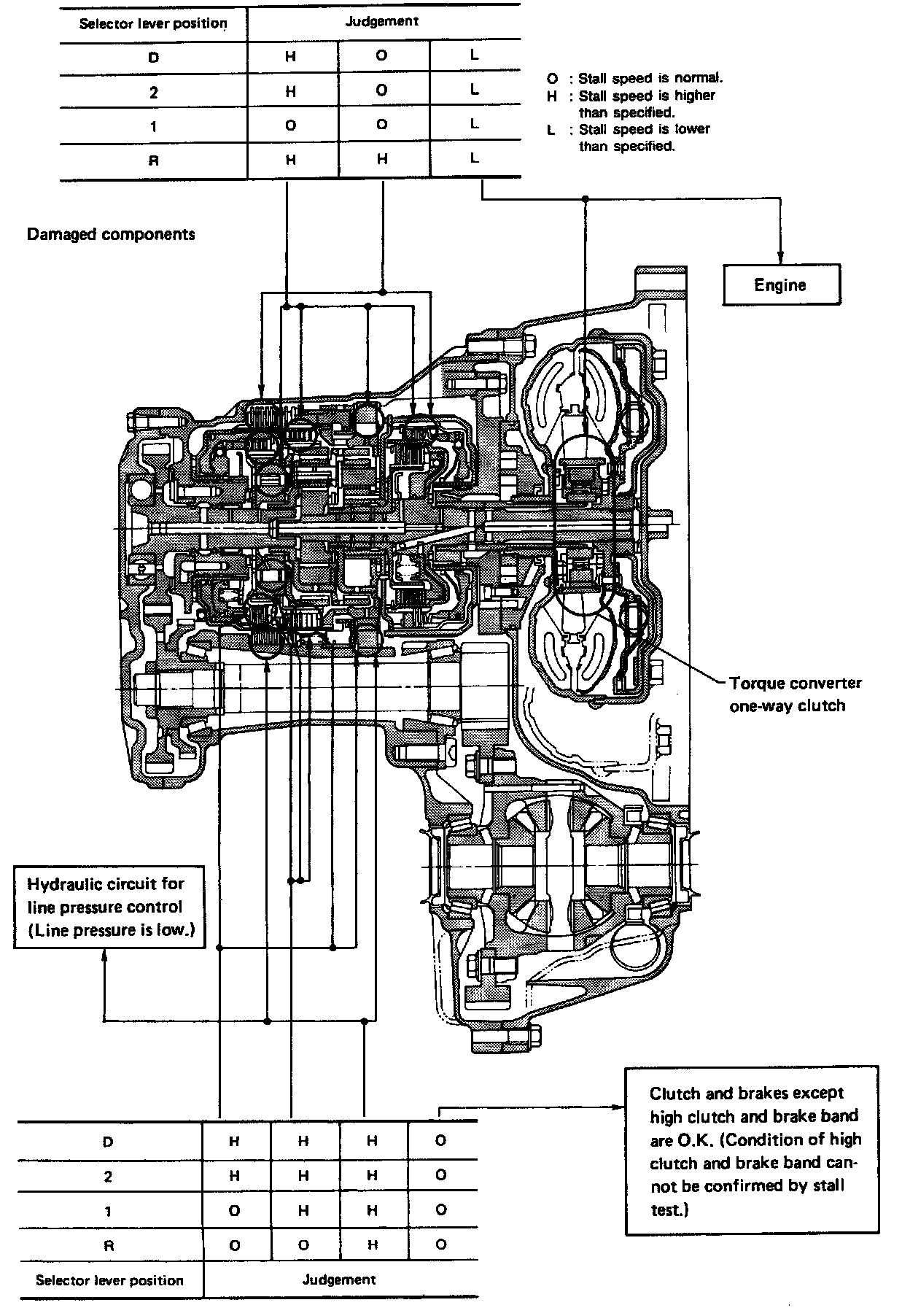 10. Perform stall tests in the same manner as in steps 5 through 9 with selector lever in "2", "1" and "R" positions, respectively.