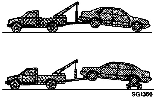 NISSAN recommends that vehicle be towed with the driving (rear) wheels off the ground as illustrated.