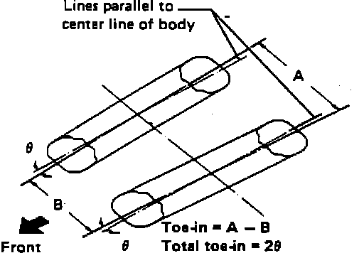 Rear toe is the measurement of the rear wheels in relation to the vehicle centerline, Fig. 1. The leading edge of each rear wheel should toe-in slightly toward the vehicle centerline to ensure proper vehicle tracking. Rear toe should be inspected using suitable alignment gauges, following manufacturer's instructions. When checking or adjusting rear toe, always ensure the amount that the left and right wheels toe-in is as equal as possible.