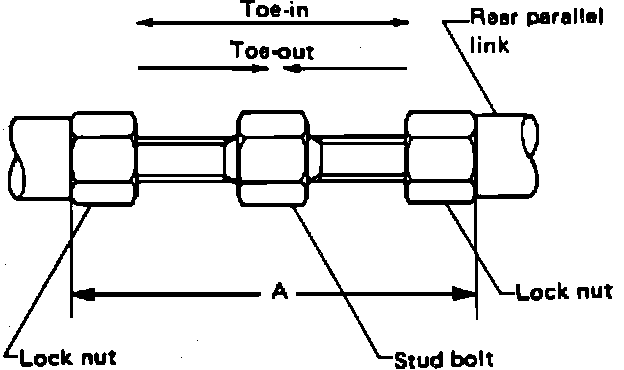 2. Loosen locknuts and adjust parallel link length to obtain specified toe-in, noting the following: