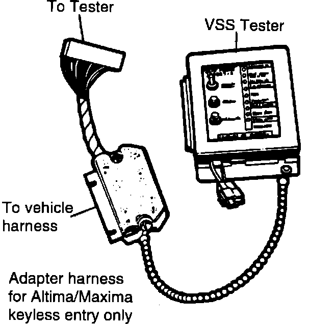 The VSS Tester from Kent-Moore has been updated to work on the Altima/Maxima Keyless entry system. The updated version was shipped to your dealer in July 1993. If you purchased a tester after July 1993, you have the latest version. Listed below is the updated information to use the new VSS tester.