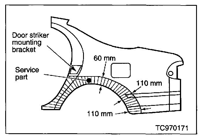 Only vehicles with perforation in the rear fender wheel arch area should be repaired with the special service parts indicated at the end of this bulletin. The service parts are intended to reduce repair costs by eliminating the need for replacement of the entire quarter panels and ensuring a consistent and effective repair procedure. Repair only the side affected.