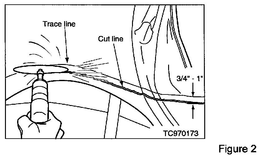 3. Do not cut quarter panel at the trace line. Cut off damaged portion of the quarter panel with allowance below the traced line (inside line) using a grinding wheel or cutting saw (see Figure 2).