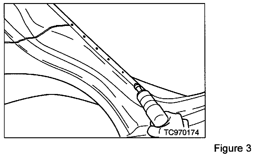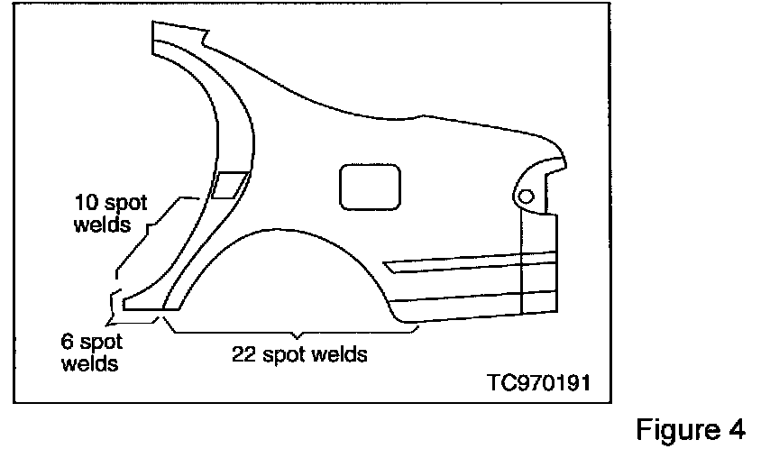 4. Use a spot weld cutter (114" diameter) to drill the spot welds around the wheel arch (at the fender lip area) and around the door frame opening to remove the corroded wheel arch (see Figure 3). Refer to Figure 4 to remove the correct number of spot welds.