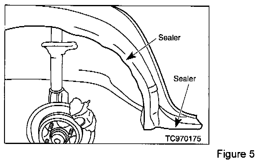 6. Use a scraper to remove all remaining sealers on the exposed outer wheel house and on the exposed rocker panel (see Figure 5).