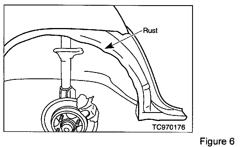 3. Check severity of corrosion damage on outer wheel house. If perforation exists, apply Fusor EZ plastic body repair adhesive (Lord stock # 101EZ) and Fusor structural SMC/fiberglass patch kit (Lord stock # 706) to the affected areas (see Figures 8 and 9).