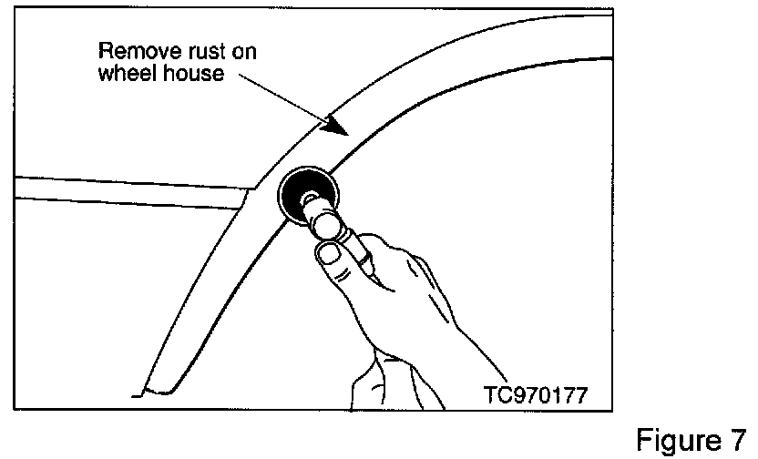 Prepare for Installation1. Make sure the exposed wheel house and fender lip are clean. Use a grinding disc and Scotch Brite pad to remove all corrosion. You must completely remove all red rust (see Figures 6 and 7).