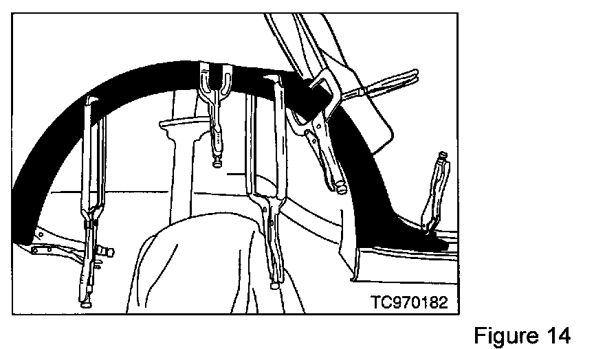 CAUTION: Do not over-tighten clamps. Over tightening could reduce adhesion strength and permanently distort quarter panel and/or service part.